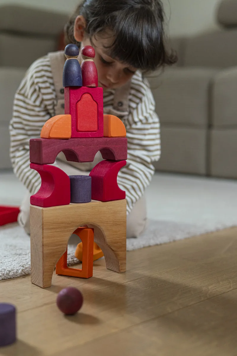 De kleinsten maken kennis met het bouwspeel als eerste vormenpuzzel, waarbij ze passende vormen en kleurnharmonieën leren herkennen.