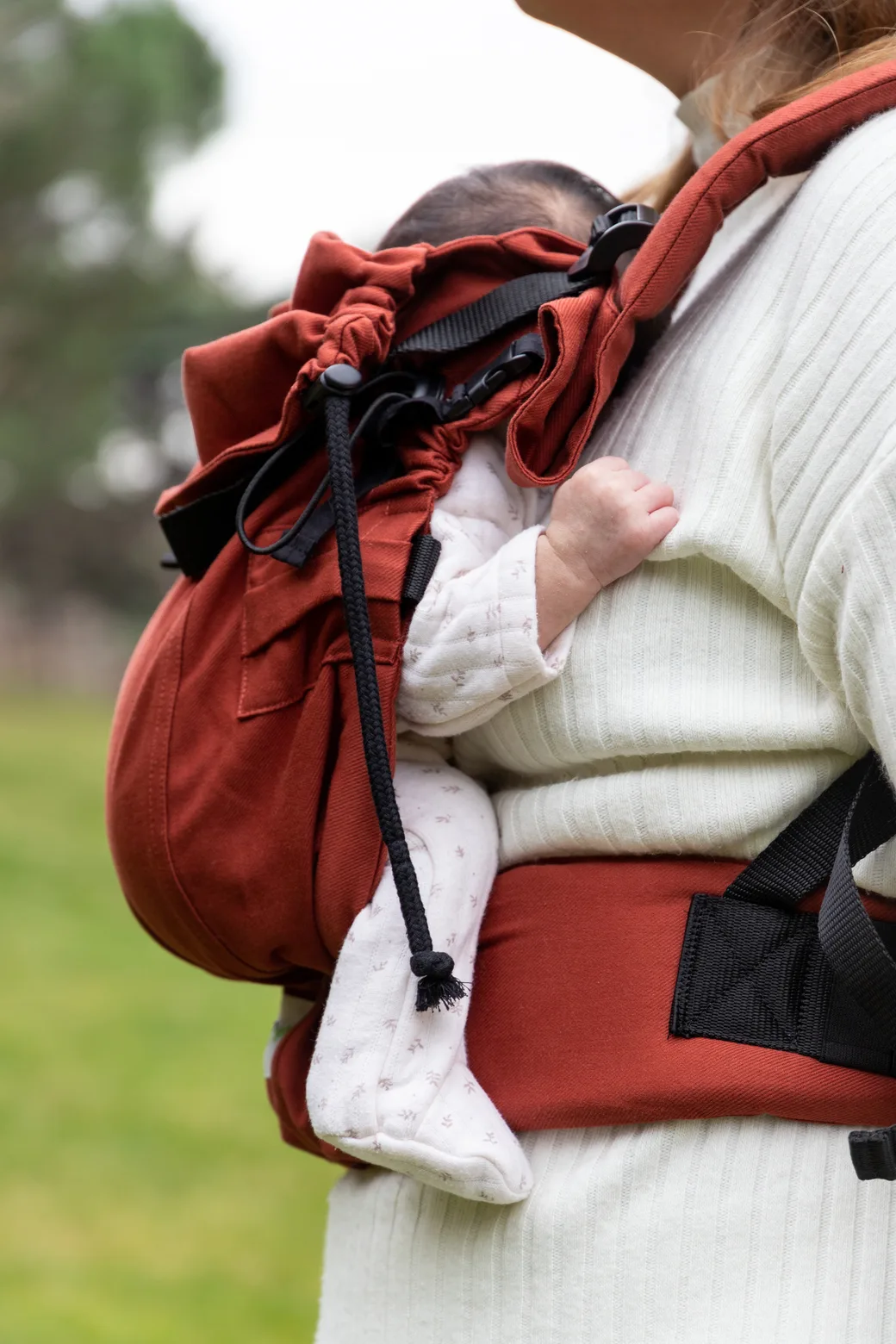 Met het klittenband aan de binnenkant van de tailleband kun je de breedte van het rugpand aanpassen aan de kniebreedte van je baby.