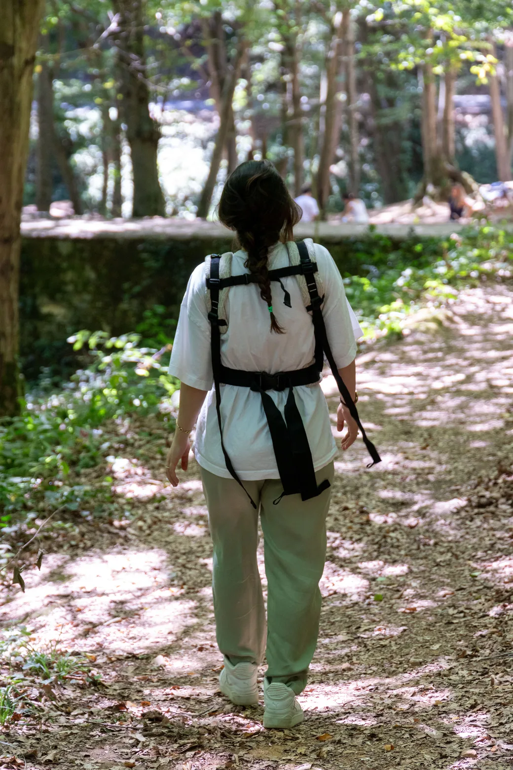 Met het klittenband aan de binnenkant van de tailleband kun je de breedte van het rugpand aanpassen aan de kniebreedte van je baby.