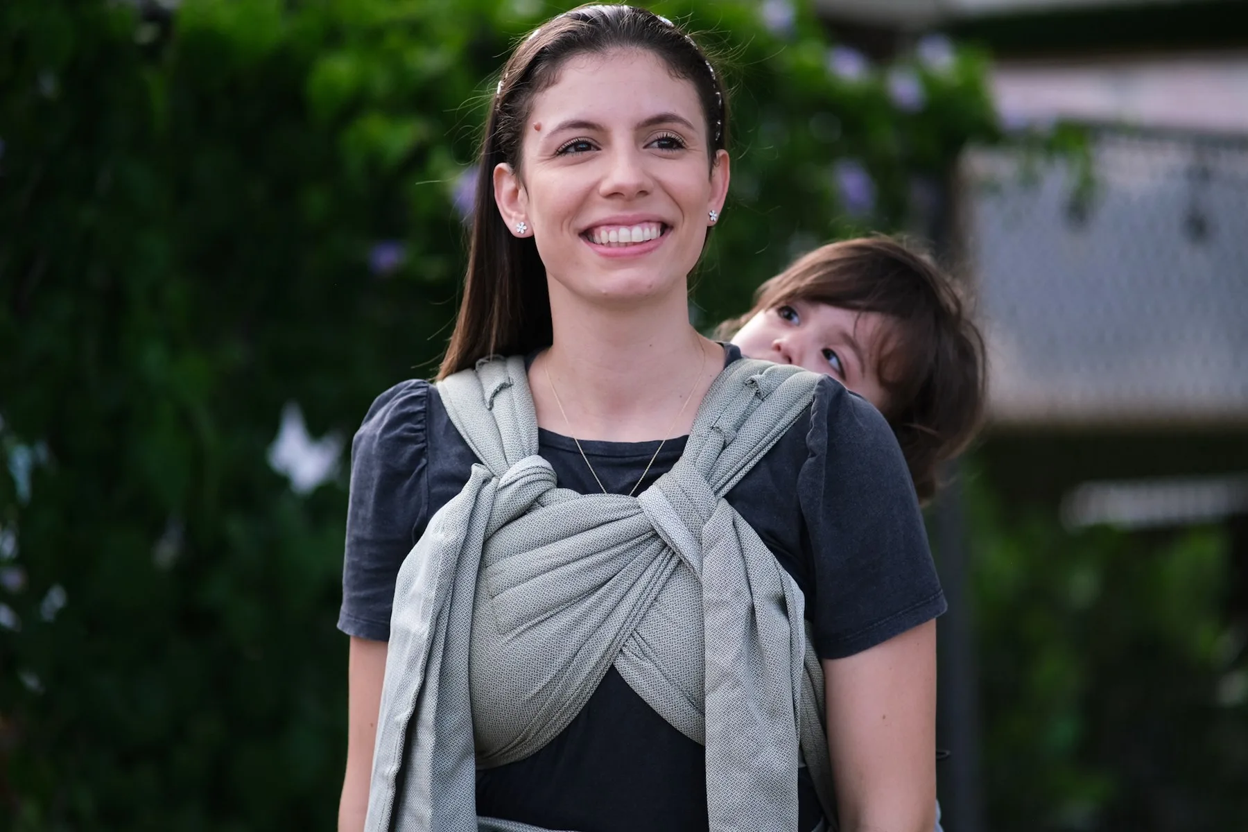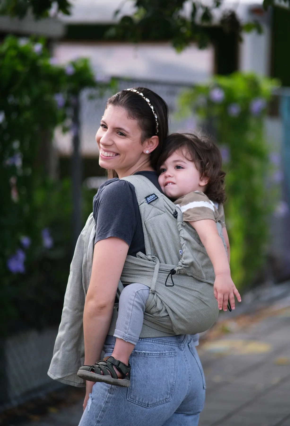 Het volledig verstelbare rugpaneel groeit met je kind mee en ondersteunt de natuurlijke ontwikkeling van de heupen in zowel voor- als achterwaartse draagposities, met spreidbare schouderbanden van geweven draagdoekstof.